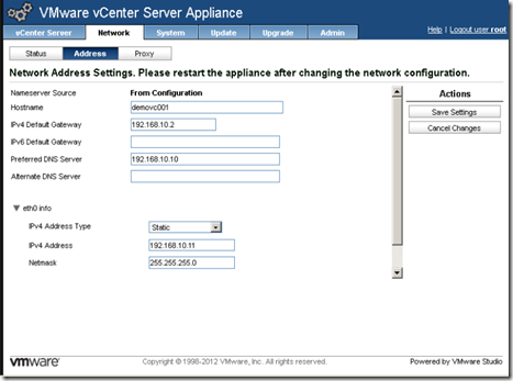 After you cancel the wizard, select the network tab and configure the hostname and network properties including the static IP as shown in figure 1.12.